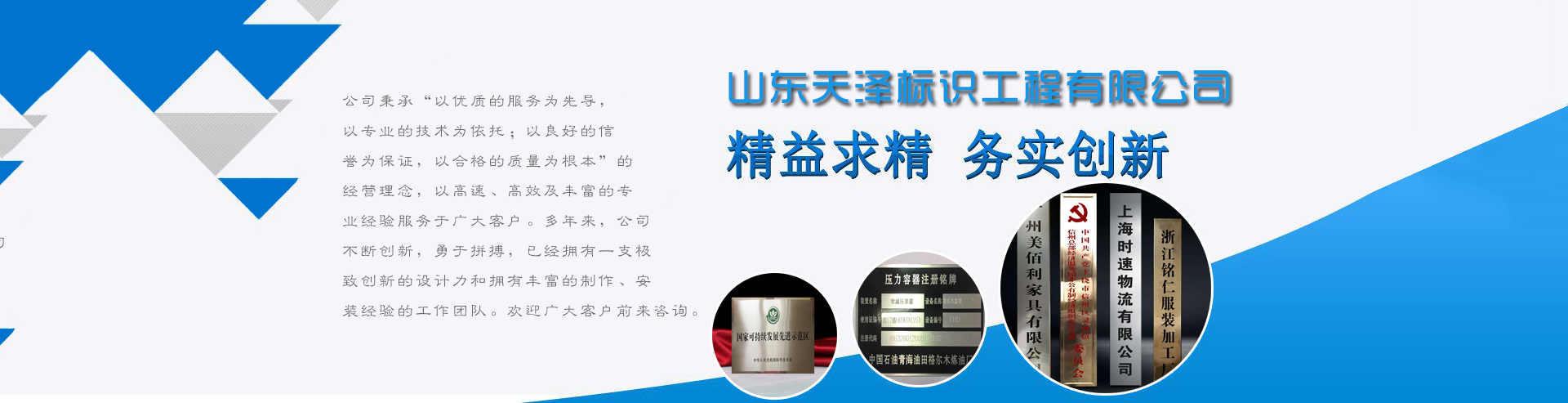 山東天澤標(biāo)識工程有限公司是一家集創(chuàng)意設(shè)計(jì),生產(chǎn)制造,安裝服務(wù),售后保障為一體的多元化公司。我們擁有先進(jìn)的設(shè)備,專業(yè)的人才,專業(yè)從事蝕刻,仿古,做舊,絲印,烤漆等工藝加工。主要生產(chǎn)機(jī)器銘牌、科室牌、樓棟牌、門牌、不銹鋼牌、銅牌、鋁牌、鈦金牌、砂金牌、授權(quán)牌、道路標(biāo)識牌及各類金屬板材的裝飾花紋,同行可代工。 我們一直秉承“以質(zhì)量、效率、服務(wù)博得客戶的滿意,以誠信、合作雙贏求得發(fā)展”作為核心價(jià)值,立足創(chuàng)新產(chǎn)品質(zhì)量,誠信服務(wù),真誠合作,共同發(fā)展,是我們始終如一的追求。為客戶提供優(yōu)質(zhì)的產(chǎn)品是我們永恒的方針。我們將不斷超越自我,一如既往地為客戶創(chuàng)造價(jià)值,提供更優(yōu)質(zhì)的產(chǎn)品和服務(wù)!